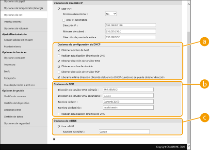 Adoptado por Bonjour, mDNS (DNS de multidifusión) es un protocolo para asociar un nombre de host con una dirección IP sin usar DNS. Seleccione la casilla de verificación para activar mDNS e introduzca el nombre mDNS en el cuadro de texto [Nombre de mDNS].