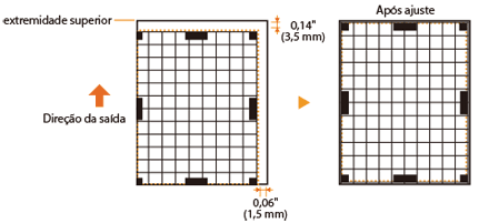 Ajuste a posição de impressão para confirmar a direção e a distância do ajuste. A posição de impressão pode ser ajustada no intervalo de -0,14" (-3,5 mm) a +0,14" (+3,5 mm) na vertical e na horizontal, em incrementos de 0,004" (0,1 mm).