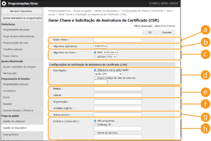 Pode gerar uma chave e CSR na máquina. Também pode apresentar os dados da CSR no ecrã e exportá-los como um ficheiro.