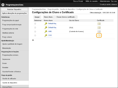 Os certificados gerados nesta máquina não têm uma assinatura da CA, o que pode causar erros de comunicação com alguns pares de comunicação. Para solicitar um certificado com assinatura da CA, são necessários dados de solicitação de assinatura de certificado (CSR). Um utilizador que inicie sessão com privilégios de administrador pode gerar uma CSR.