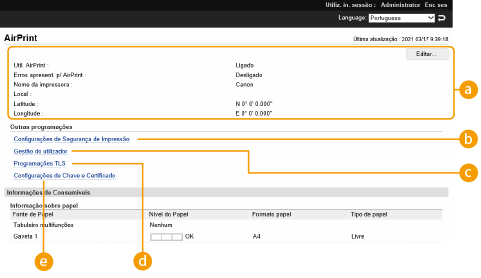 Permite verificar os valores introduzidos nas definições de AirPrint, como o nome e a localização da máquina. Pode clicar em [Editar] para alterar as definições.