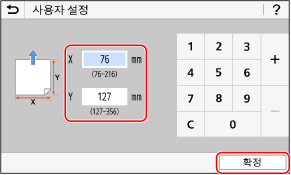 2 | [X]와 [Y]에 값을 입력하고 [확정]을 누릅니다. 자주 사용하는 비표준 크기를 등록한 경우 [S1]~[S3]을 눌러 해당 크기를 호출할 수 있습니다. |