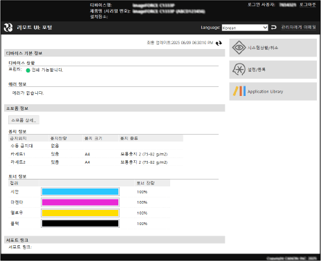 리모트 UI에 로그인하면 포털 페이지(리모트 UI 상위 페이지)가 나타납니다. 여기서 기기의 작동 상태를 확인하고, 다양한 정보를 보고, 단추 조작으로 설정을 변경할 수 있습니다.