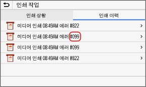인쇄를 수행할 수 없거나, I-팩스를 수신할 수 없거나, 다른 오류가 발생하는 경우, 작업 로그에 오류 코드("#"로 시작하는 세 자리 숫자)가 표시됩니다.