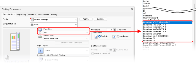 In [Page Size] on the [Basic Settings] tab, select the size of the envelope.