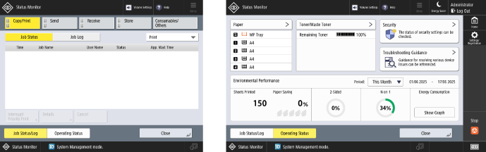 You can select [Job Status/Log] to check the processing status and history of each function and the remaining amount of consumables and parts.