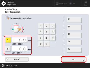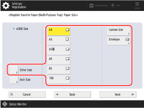 For the sizes of paper that are displayed when [Other Size] is pressed, see the following: