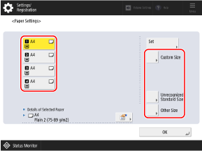 If paper of a size that is not detected automatically is loaded, press [Unrecognized Standard Size] to select the size of the loaded paper.