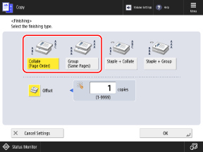 If you select [Collate (Page Order)] in Step 2, enter the number of copies at which to offset the output position, using the numeric keys.