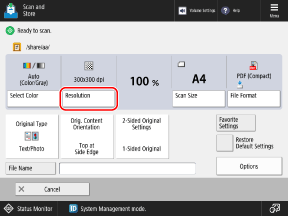 * You cannot set the resolution when saving scanned data to a Mail Box. (The resolution is fixed to [600x600 dpi].)