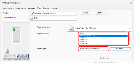 In [Paper Source] and [Paper Type] on the [Paper Source] tab, select the multi-purpose tray and envelope.