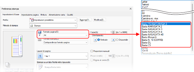 In [Formato pagina] nella scheda [Impostazioni di base], selezionare il formato della busta.