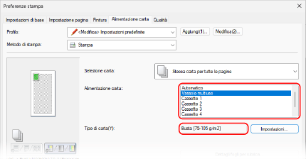 In [Alimentazione carta] e [Tipo di carta] nella scheda [Alimentazione carta], selezionare il vassoio multiuso e la busta.