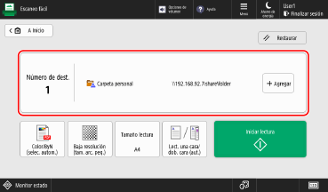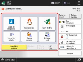Con Lectura y envío fácil/Escaneo fácil, puede configurar funciones básicas como los destinos especificados y las opciones de color, mediante sencillas operaciones con botones.