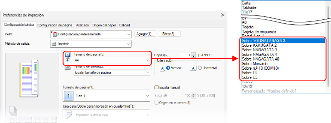 En [Tamaño de página] en la pestaña [Configuración básica], seleccione el tamaño del sobre.