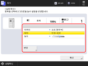 이 화면의 설정 버튼을 사용하여 복사 시 설정을 구성할 수 있습니다.