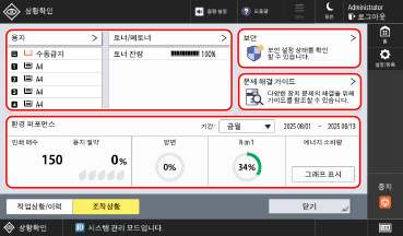 용지 및 토너 잔량, 기기의 보안 조치 상태, 팩스 송수신 및 인쇄 중 발생한 문제를 해결하기 위한 지원 정보, 특정 기간 이내의 인쇄 작업 상태 및 전력 소비와 같은 여러 항목의 상태를 함께 확인하기 위한 화면을 표시할 수 있습니다.