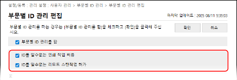 [ID를 알수없는 인쇄 작업 허용] 및 [ID를 알수없는 리모트 스캔작업 허가] 확인란 선택을 취소합니다.