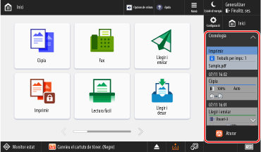 Seleccioneu [Estat/registre de treballs] per comprovar l'estat del processament i l'historial de cada funció i la quantitat restant de consumibles i parts.