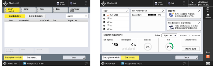 Seleccioneu [Estat/registre de treballs] per comprovar l'estat del processament i l'historial de cada funció i la quantitat restant de consumibles i parts.