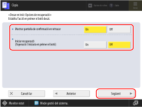 Establiu [Mostrar pantalla de confirmació en retrucar] i [Iniciar recuperació] en [Off].