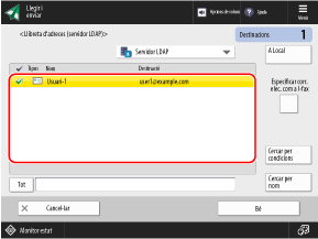 Quan la informació de l'usuari es gestiona amb un servidor LDAP, podeu cercar aquesta informació i especificar les destinacions des de la pantalla de lectura (Llegir i enviar) o de fax del tauler de control.