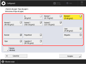 El tipus de paper predeterminat és Normal 1 o Normal 2. Quan es carregui paper d'un altre tipus o quan la mida que es mostra al tauler de control sigui diferent a la del paper carregat, canvieu els paràmetres del paper.