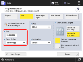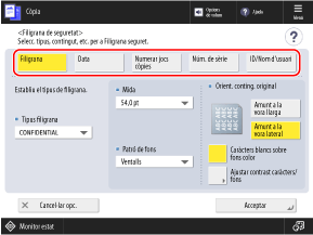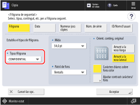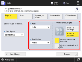 A la pantalla de còpia, premeu [Opcions] [Filigrana de seguretat]. Pantalla de còpia