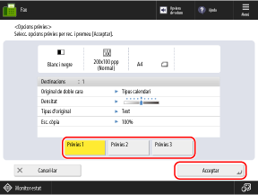 Podeu prémer [Opcions prèvies] per recuperar les opcions utilitzades per enviar faxos anteriorment. La destinació d'enviament també s'aplica juntament amb les opcions que es recuperen.