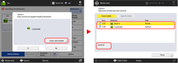 Per cancel·lar un altre treball, premeu [Compr. altres treballs], seleccioneu el treball que vulgueu cancel·lar de la llista Enviar treballs i premeu [Cancel·lar].