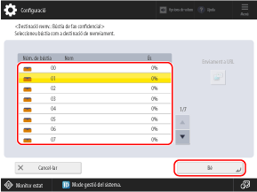 Seleccioneu la bústia de fax confidencial que vulgueu utilitzar com a destinació de reenviament o ubicació de l'emmagatzematge i premeu [Bé].