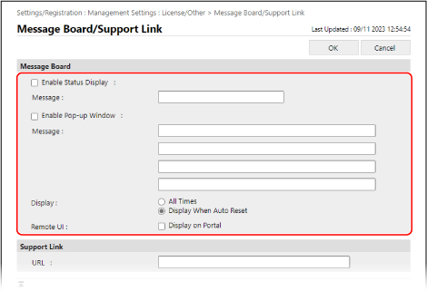 Quan també vulgueu mostrar un avís a [Message Board], a la pàgina del portal de Remote UI (IU remota), marqueu la casella de selecció [Display on Portal] per a [Remote UI].