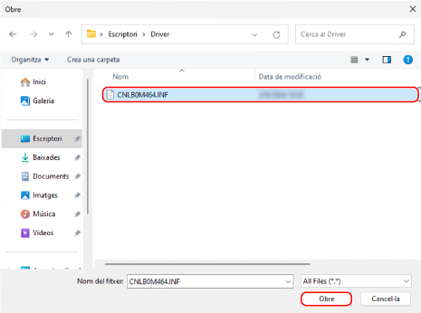 Obriu la carpeta del controlador de la impressora, seleccioneu el fitxer INF de la carpeta [Driver] i feu clic a [Obre].