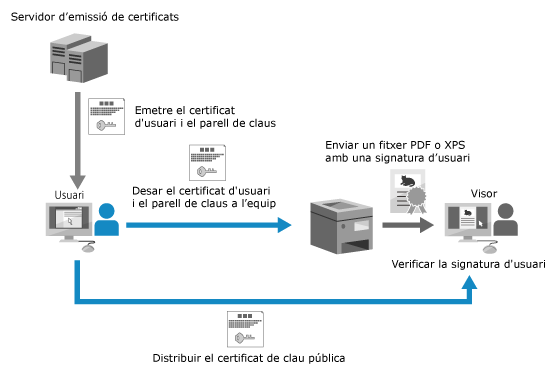 Podeu desar a l'equip la clau i el certificat (certificat d'usuari) per utilitzar-los per a la signatura d'usuari i enviar el certificat de clau pública al visor. Després de registrar la clau i el certificat, podeu afegir el nom d'usuari d'inici de sessió com a signatura a un document llegit.