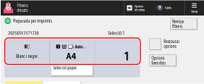 El paper que s'utilitzarà establert actualment i el nombre d'impressions es mostren al centre de la pantalla. Comproveu aquests paràmetres per garantir la impressió correcta.