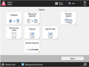 [Numerar pàgines]/[Numerar jocs còpies]/[Filigrana]/[Imprimir data]