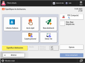 Utilitzeu aquesta pantalla per especificar la destinació i configurar el format del fitxer o altres opcions en efectuar enviaments.