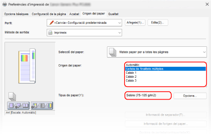 A [Origen del paper] i [Tipus de paper], a la pestanya [Origen del paper], seleccioneu la safata multiús i el sobre.