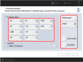 Po vložení papíru do víceúčelového zásobníku se na ovládacím panelu zobrazí následující obrazovka. Nastavte velikost a typ papíru podle vkládaného papíru.