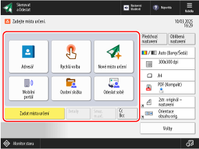 Pomocí funkce Snadné skenování a odeslání/Snadné skenování můžete tlačítky jednoduše nakonfigurovat základní funkce, jako jsou určené cíle a nastavení barev.