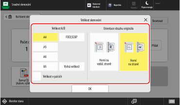 Stiskněte tlačítko nastavení velikosti skenování a vyberte velikost skenování a orientaci originálu.