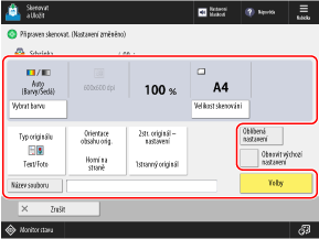 Když zobrazíte místo pro uložení stisknutím [Skenovat a Uložit] na obrazovce [Hlavní obrazovka] a poté stisknete [Skenovat], zobrazí se obrazovka skenování.