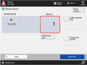 Chcete-li tisknout podle nastavení tisku uloženého v souboru, nestiskněte [Změnit nastavení tisku]. Stisknutím [Změnit nastavení tisku] můžete deaktivovat uložená nastavení tisku.