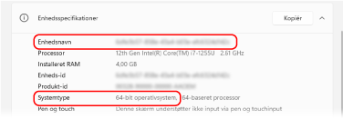 Kontrollér computernavnet og operativsystemets version under [Enhedsspecifikationer].