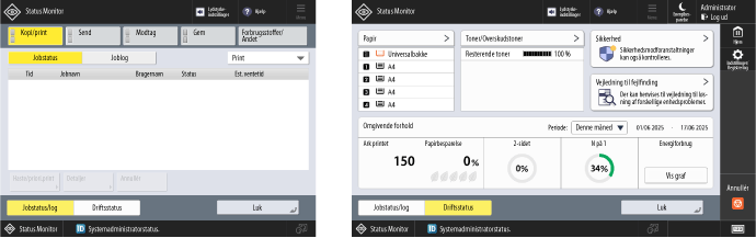 Du kan vælge [Jobstatus/log] for at kontrollere behandlingsstatus og historik for hver funktion og den resterende mængde forbrugsstoffer og dele.