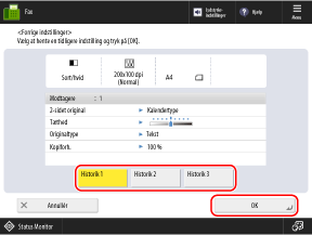 På skærmen [Tidligere indstillinger] skal du vælge den historik, du vil genkalde, og trykke på [OK].