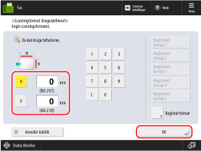 Tryk på [Registrér format]  vælg den knap, som du vil registrere størrelsen på  tryk på [Registrér/Redigér]  indtast længder for siden [X] og side [Y]  tryk på [OK]  [Luk]