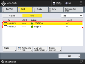 Når afsendelsesstatusser vises, kan du trykke på [Print liste] for at udskrive listen for afsendelsesstatusser.