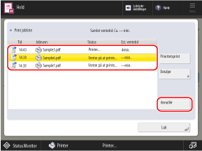 Annullér], vælge det job, der skal annulleres, fra printjoblisten og trykke på [Annullér].