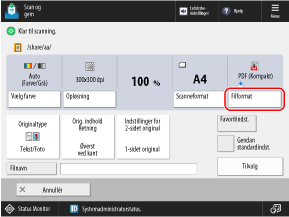 Tryk på knappen til indstilling af filformat på scanningsskærmen. Skærmbilledet Scanning